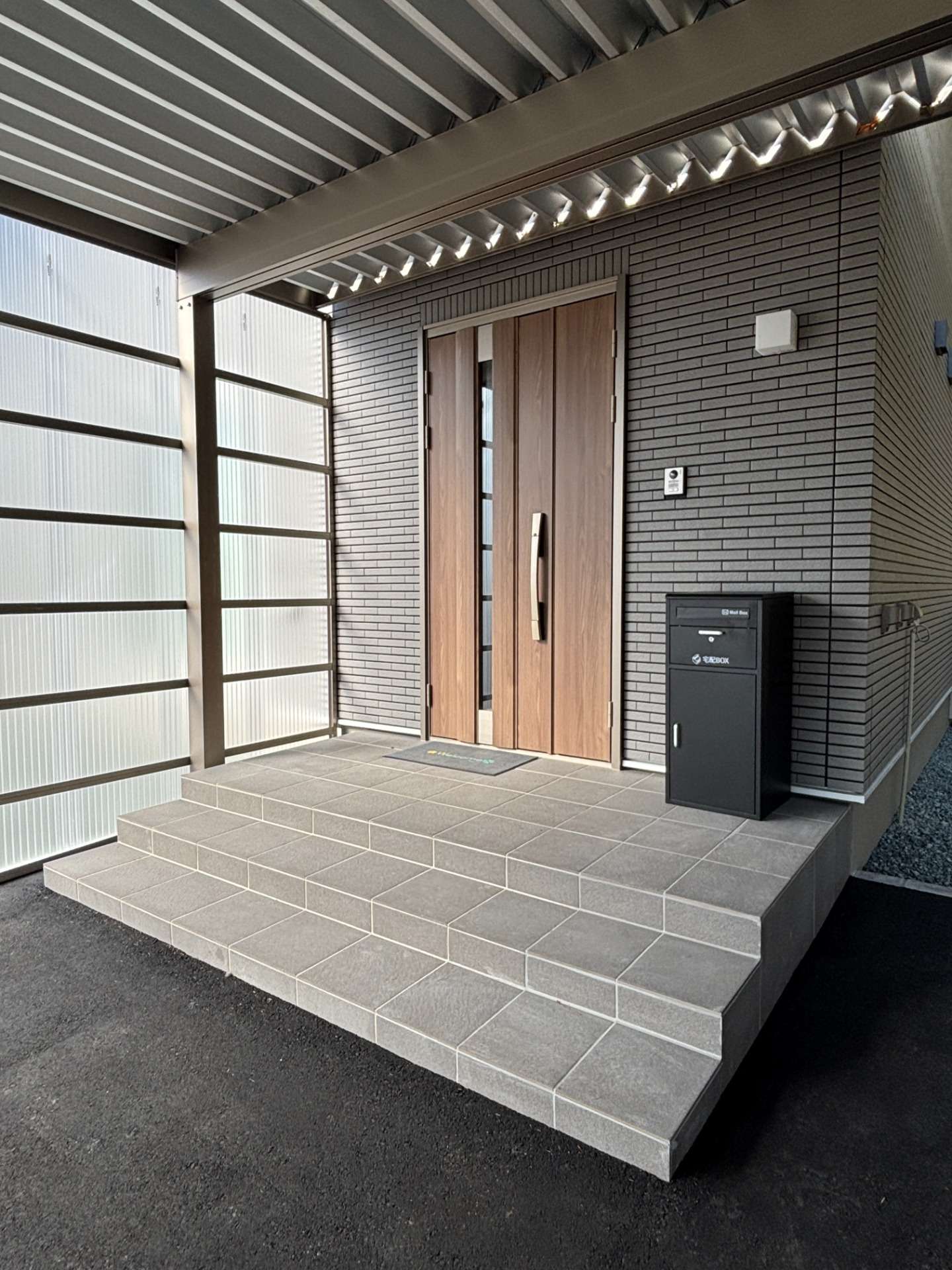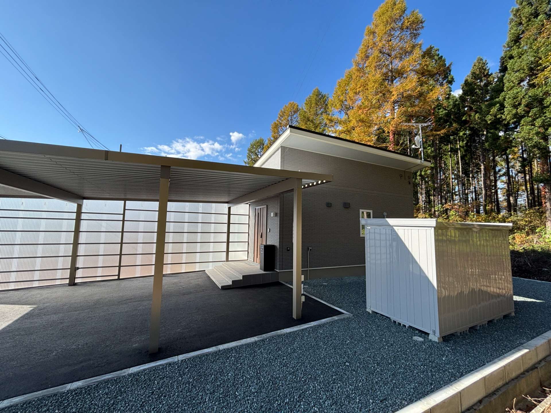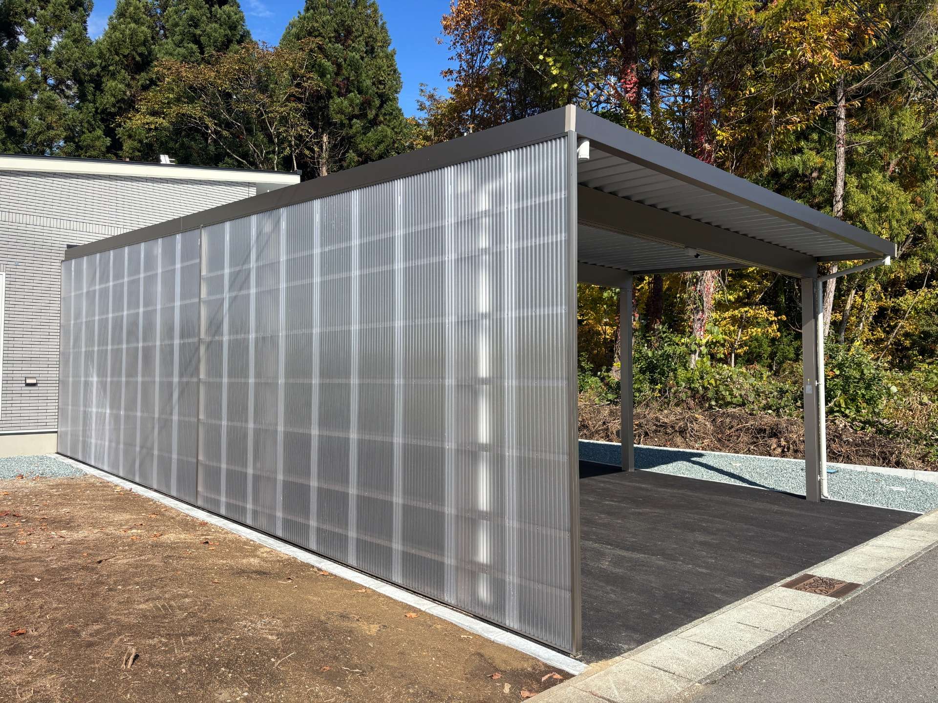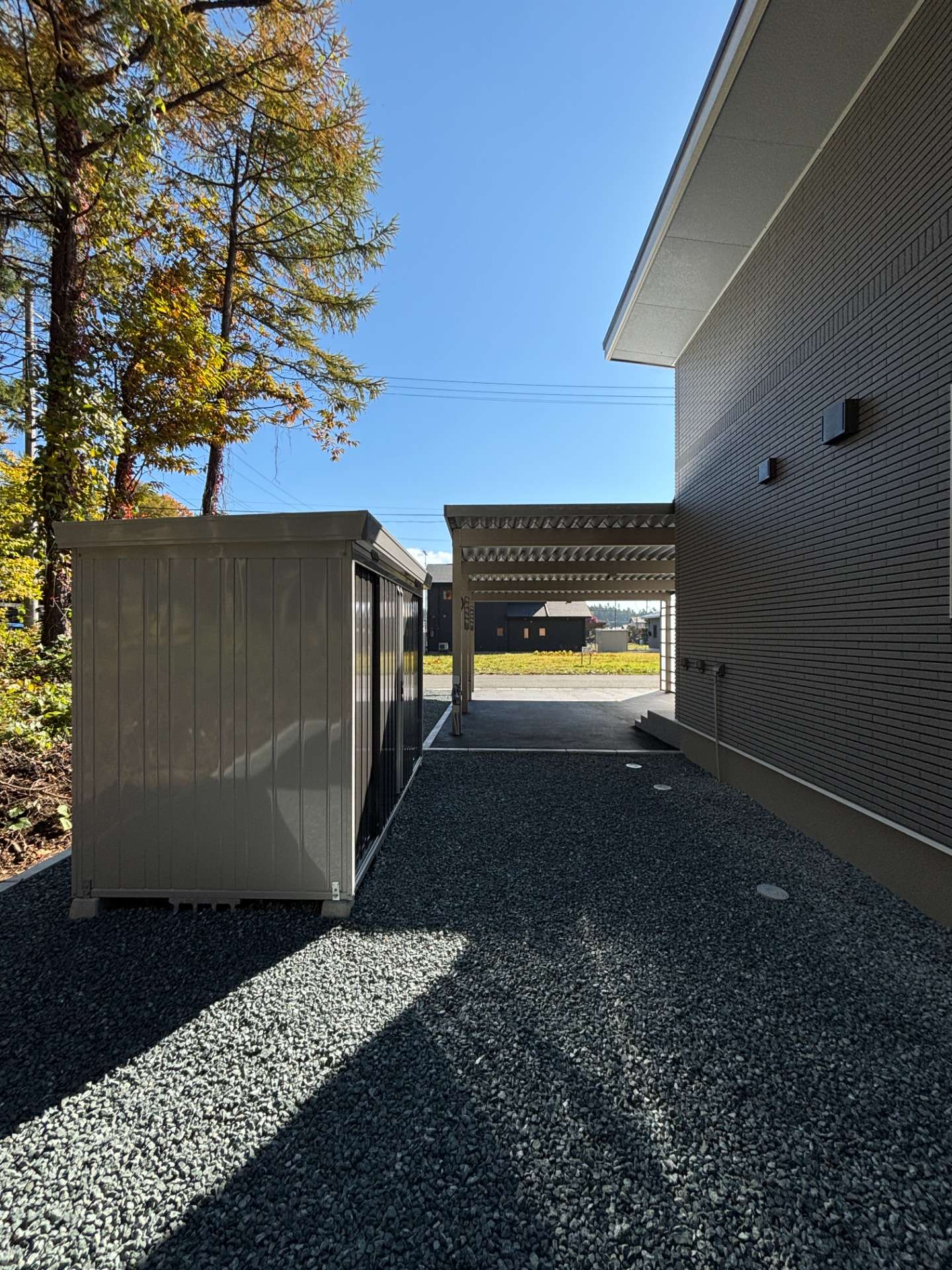 積雪が多い地域にお住まいで雪や雨を防ぐためサイドパネルを取り付け、すき間カバーも取り付けしました。カーポートは三協アルミG1-R奥行2連結4台用。街灯が少ないため照明を付け明るさをプラス。駐車スペースはアスファルト舗装、境界に宅地境界ブロックを積み建物周りは砂利を敷きました。他、物置工・玄関タイル工